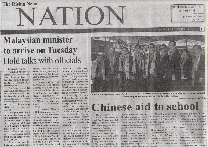 這次活動在籌備和組織過程中得到了尼泊爾政府、友好組織與尼泊爾人民的大力支持,首先尼泊爾政府和衛(wèi)生部門為活動提供了大量的便利條件,尼泊爾的政界也非常支持這次活動,尼泊爾主要政黨的領袖,與當?shù)卣男姓L官都參與了這次活動,并爭先恐后發(fā)表講話。尼泊爾的主要報紙也在顯著位置進行了大量的報道。認為這是中國人民對尼泊爾的一次重要幫助,希望中國的民間組織以后能更多的到尼泊爾來開展活動,讓尼泊爾老百姓也能因中國經濟的發(fā)展而得到實惠。
