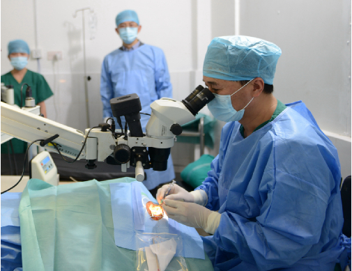 姚曉明博士在簡陋的手術室里為尼泊爾患者實施復明手術。
