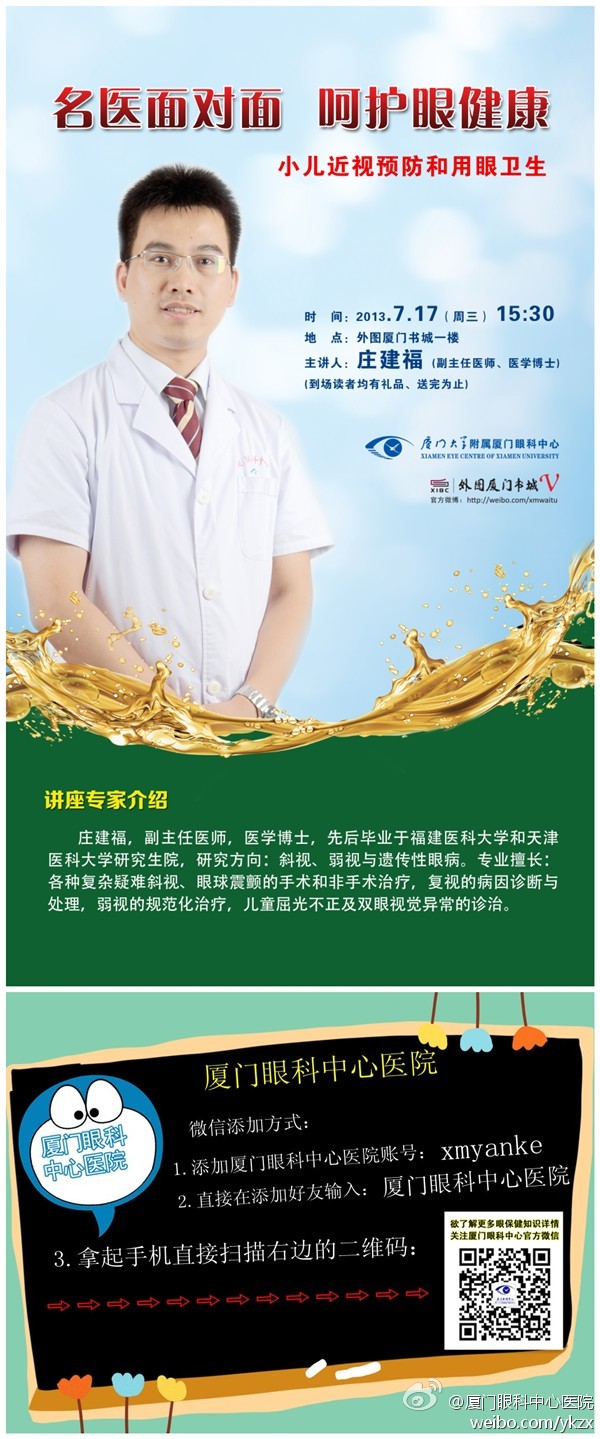 2013年7月17日15:30分,廈門眼科中心小兒眼科莊建福博士將在外圖廈門書城一樓免費為青少年講述如何預(yù)防近視?,F(xiàn)場將還有免費禮品贈送。
