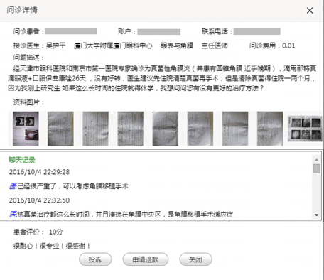另外一位22歲的研究生小雷的情況則比較緊急,他經(jīng)天津市眼科醫(yī)院和南京第一醫(yī)院專家確診為真菌性角膜炎,并患有圓錐角膜近乎晚期,使用相關(guān)藥物沒(méi)有好轉(zhuǎn),江西當(dāng)?shù)氐尼t(yī)生建議其先住院清除真菌再手術(shù)。因?yàn)榍宄婢米≡阂粌蓚€(gè)月,剛上研究生的他如果長(zhǎng)時(shí)間住院就得休學(xué),實(shí)在進(jìn)退兩難的他,通過(guò)眼科通APP接通了廈門眼科中心眼表與角膜??频膶W(xué)科帶頭人吳護(hù)平主任的問(wèn)診服務(wù),盡管已經(jīng)22:30,吳護(hù)平主任還是耐心解答了他的疑問(wèn),并且給出了盡快做角膜移植手術(shù)的建議。因?yàn)閺B門眼科中心有與華廈眼科醫(yī)院集團(tuán)下各地的眼庫(kù)聯(lián)動(dòng),所以患者很快就有角膜材料。吳護(hù)平30分鐘內(nèi)的4個(gè)答復(fù)就大大緩解了小雷的焦慮,避免了休學(xué)危機(jī),他連連道謝并打算盡快接受手術(shù)。