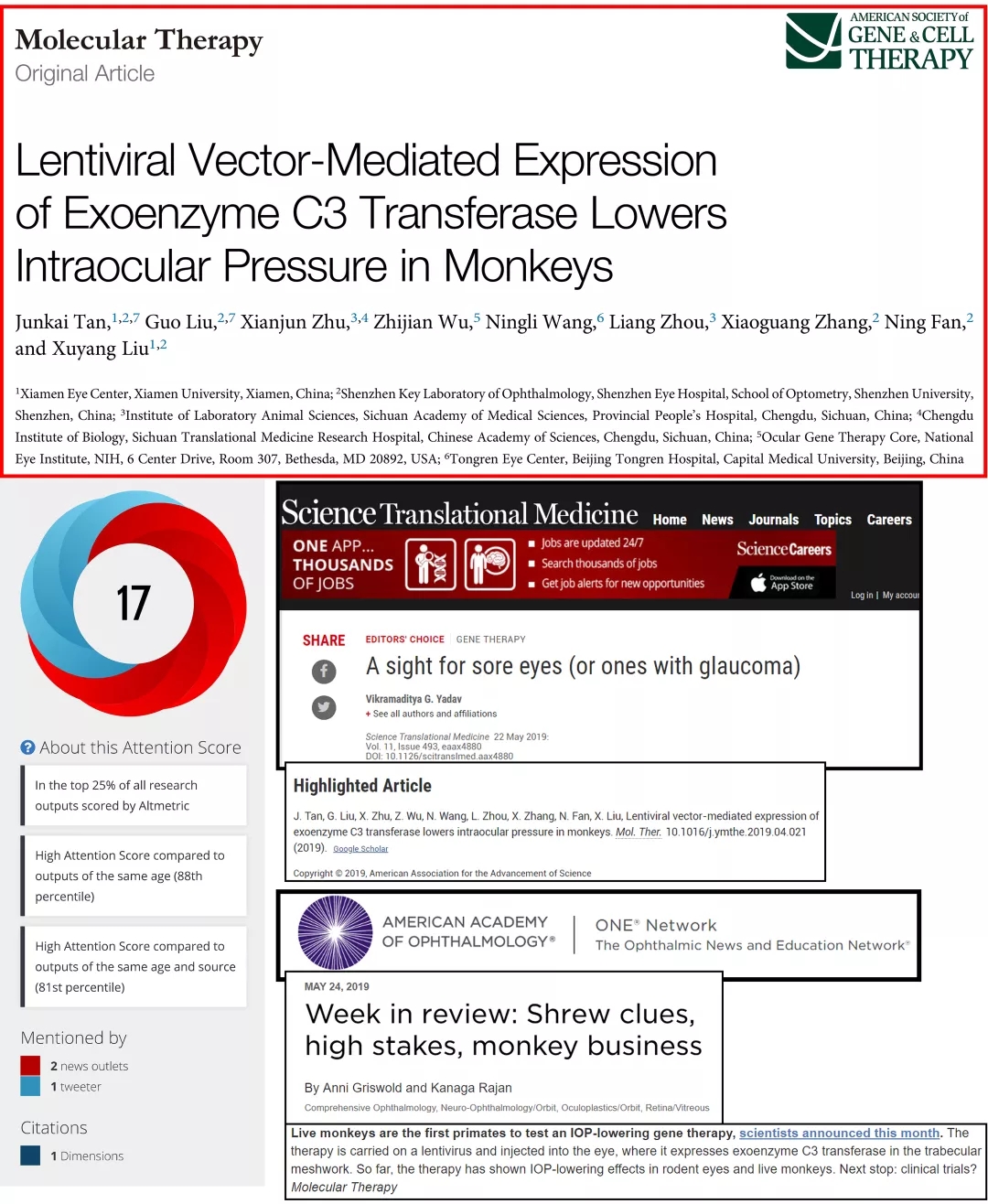 該項研究是以非人靈長類動物恒河猴為實驗對象,應用失活病毒作為載體,將有利于房水排出的基因?qū)牒镅坌×?主要房水排出通道),能引起長達112天的眼壓下降,并且未見不良反應。此前,成功地將功能基因?qū)牒镅坌×航M織并發(fā)揮降眼壓作用尚未見報道。隨即國際雜志《Science Translational Medicine》(影響因子18分)推薦了該篇研究論文,接著美國眼科學會(AAO)官方網(wǎng)站對其進行了報道,兩者均認為此項研究有較好的學術(shù)價值和臨床應用前景。目前該篇文章的Altmetric評分(社會化影響力)為17。這是繼近年來年劉旭陽教授團隊在發(fā)表多篇系列研究論文(如去年的美國IOVS雜志)后的又一成果展示,標志著該團隊在青光眼基因治療方面的工作正在穩(wěn)步發(fā)展。目前該團隊的相關(guān)工作仍在繼續(xù),比如用改進的基因治療方法已經(jīng)降低猴眼壓達10個月以上,新的文章已經(jīng)投稿,并有望于今年發(fā)表。