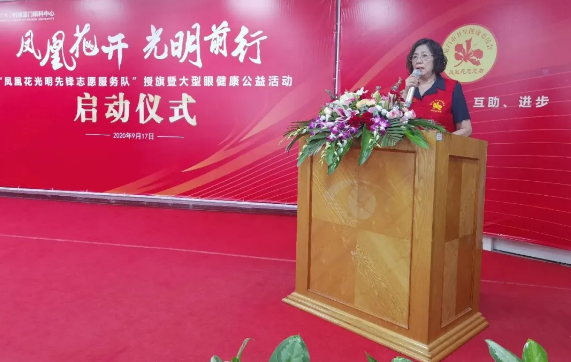 廈門市衛(wèi)生健康委員會(huì)機(jī)關(guān)黨委專職副書記、直屬黨委副書記王萍為廈門眼科中心“鳳凰花光明先鋒志愿服務(wù)隊(duì)”授旗,并宣布廈門眼科中心鳳凰花光明先鋒志愿服務(wù)隊(duì)正式成立。