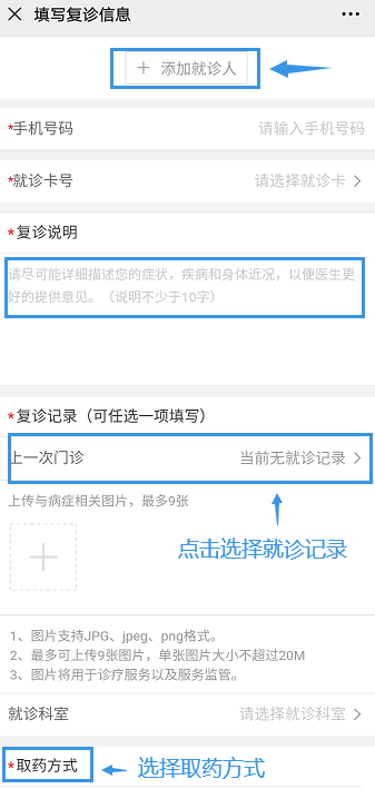 填寫就診人信息復診說明,對醫(yī)生詳細描述目前的癥狀;在復診記錄中,可以添加往期復診記錄,以便醫(yī)生快速了解病史