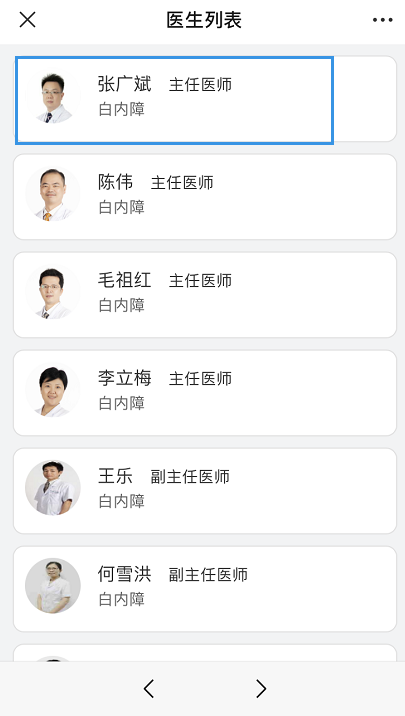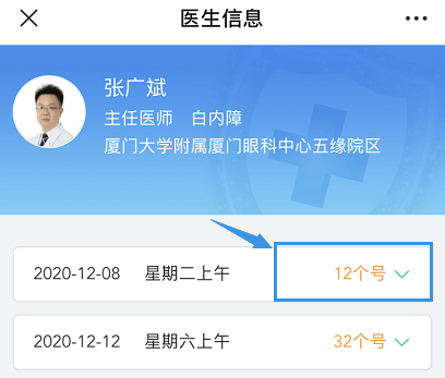 點擊“預約掛號”,選擇需要預約院區(qū)(如五緣院區(qū)),搜索或者選擇需要預約的科室(如白內障科),選擇需要預約的醫(yī)生(如張廣斌醫(yī)生),確認預約時間