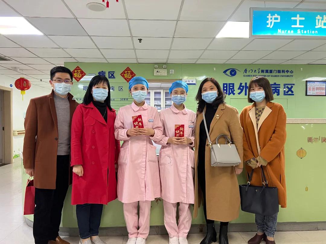 春暖大地百花艷,福滿人間萬象新。在舉家團(tuán)圓的時(shí)刻,仍有人堅(jiān)守在工作崗位。除夕當(dāng)天,廈門眼科中心執(zhí)行總經(jīng)理姚鄭玲玲、副總經(jīng)理賴瑋玲、工會主席張美嫦、人力資源部總監(jiān)石磊等院領(lǐng)導(dǎo)班子成員深入病區(qū),看望并慰問春節(jié)期間堅(jiān)守一線的醫(yī)務(wù)人員、值班后勤人員,為他們送上真切的關(guān)懷與新春的祝福。感謝他們節(jié)日期間恪守盡職,就他們在過去一年中的辛勤付出表示肯定,對疫情防控緊要關(guān)頭做出的積極貢獻(xiàn)致以崇高的敬意。