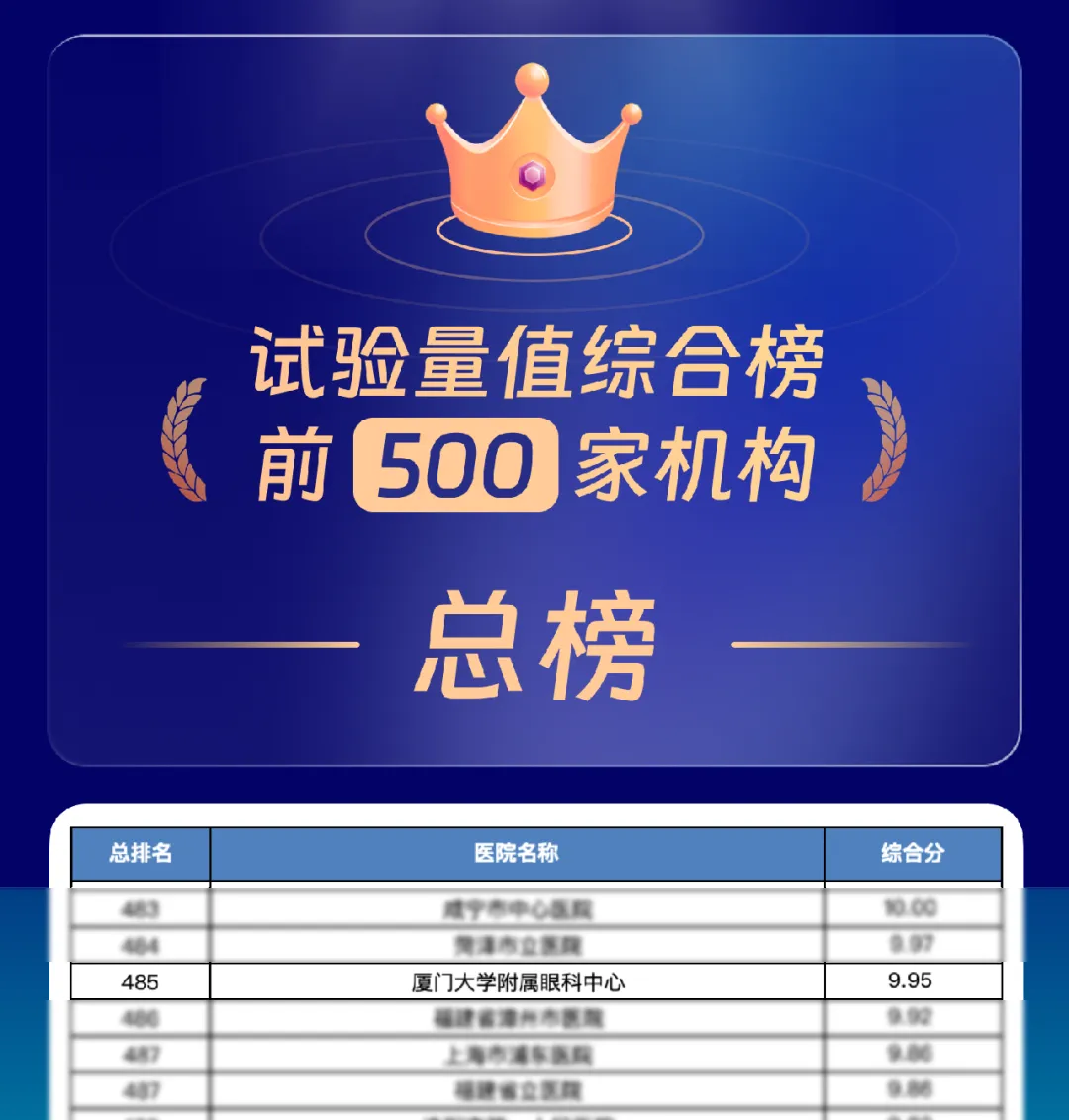 近日,新一年度的《全國GCP機(jī)構(gòu)藥物臨床試驗(yàn)量值排行榜》正式發(fā)布,廈門眼科中心再次入列全國排行榜單!