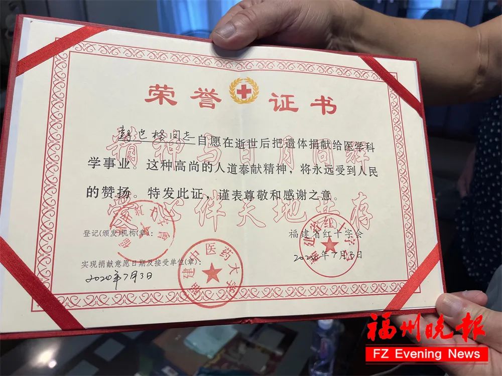 當(dāng)晚9時(shí)多,按照其遺愿,他如愿以?xún)?,捐獻(xiàn)有用的器官——眼角膜,并“坐”上開(kāi)往福建中醫(yī)藥大學(xué)的車(chē)子,成為一名大體老師(醫(yī)學(xué)界對(duì)遺體捐贈(zèng)者的尊稱(chēng))。