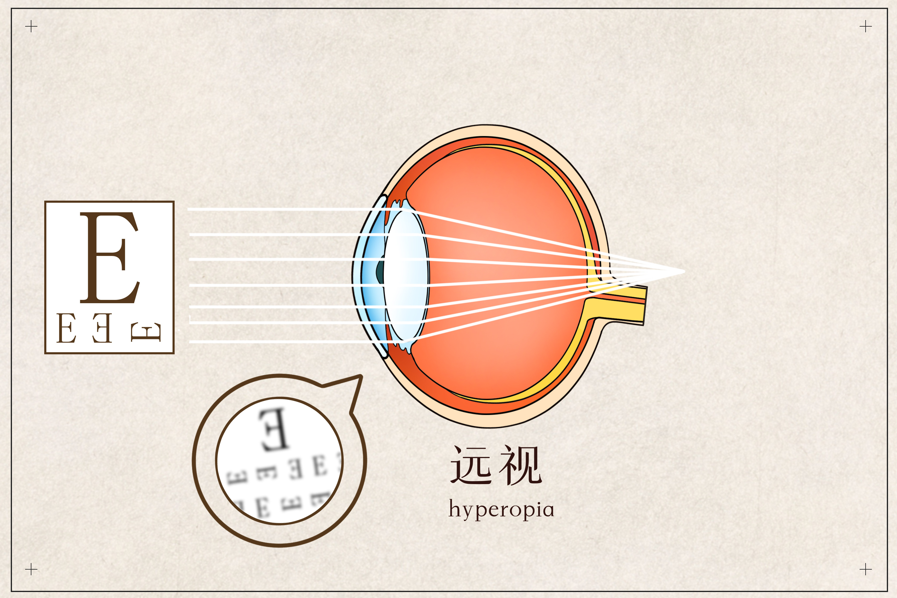 遠(yuǎn)視是指平行光線進入眼內(nèi),經(jīng)過眼球屈光系統(tǒng)(角膜、房水、晶狀體、玻璃體)的折射,在視網(wǎng)膜后方聚焦,導(dǎo)致視網(wǎng)膜上的成像模糊不清,稱為遠(yuǎn)視眼。